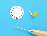 Stich mit der Ahle vorsichtig ein Loch in das Ende der beiden Zeiger und in die Mitte des Zifferblatts. Diese Aufgabe sollte ein Erwachsener übernehmen, da sie für Kinder gefährlich sein kann. Befestige die Zeiger mit der Musterbeutelklammer am Zifferblatt und klebe auf der Rückseite ein Stück Klebeband über die Klammer.