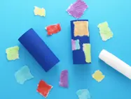 Reiße das bunte Küchenpapier in kleine Vierecke und klebe sie auf die getrockneten Toilettenrollen.